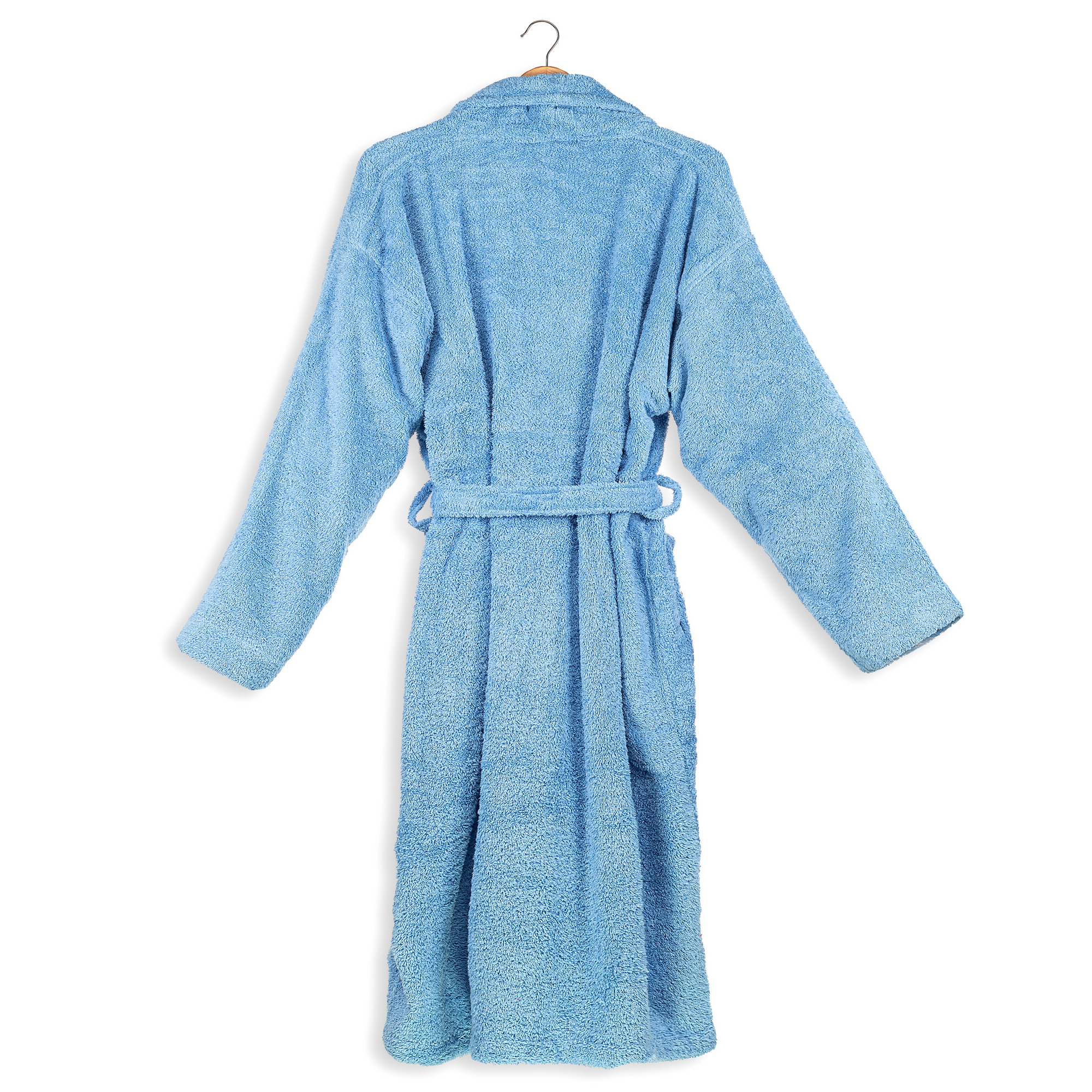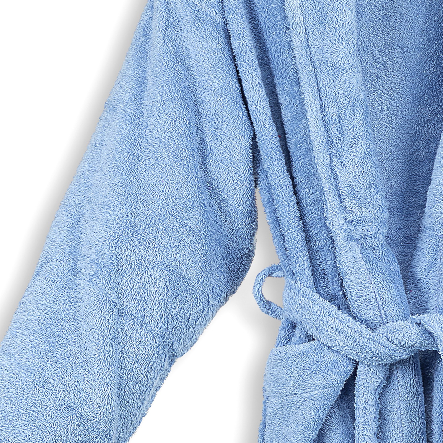 Albornoz azul liso unisex disponible en tallas M, L y XL. 100% algodón con una densidad de 380 grs/m2. Calidad al mejor precio.