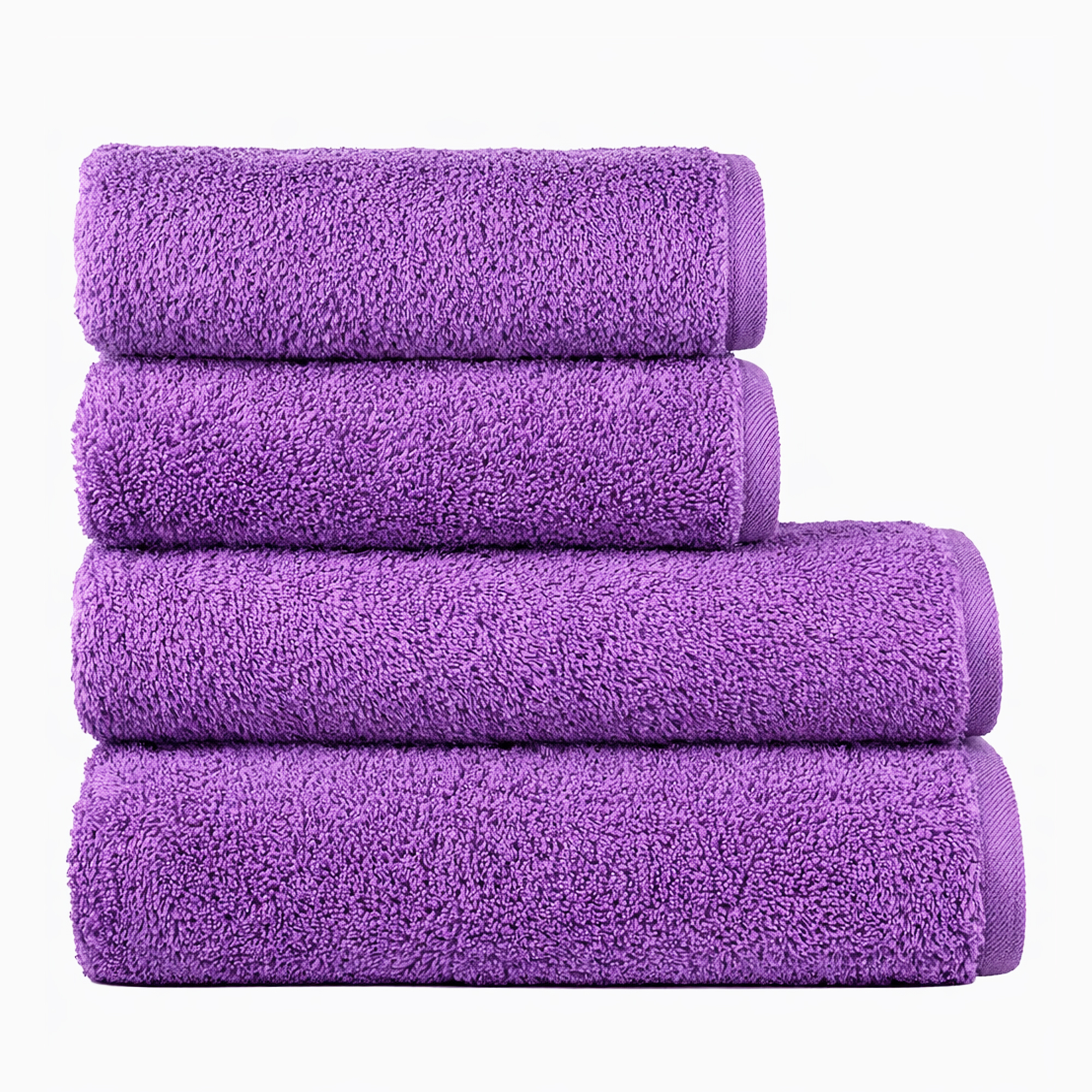 Juego de 4 toallas EXCLUSIVE morado, liso, de rizo. 100% algodón peinado con una densidad de 600 grs/m2. Calidad al mejor precio.