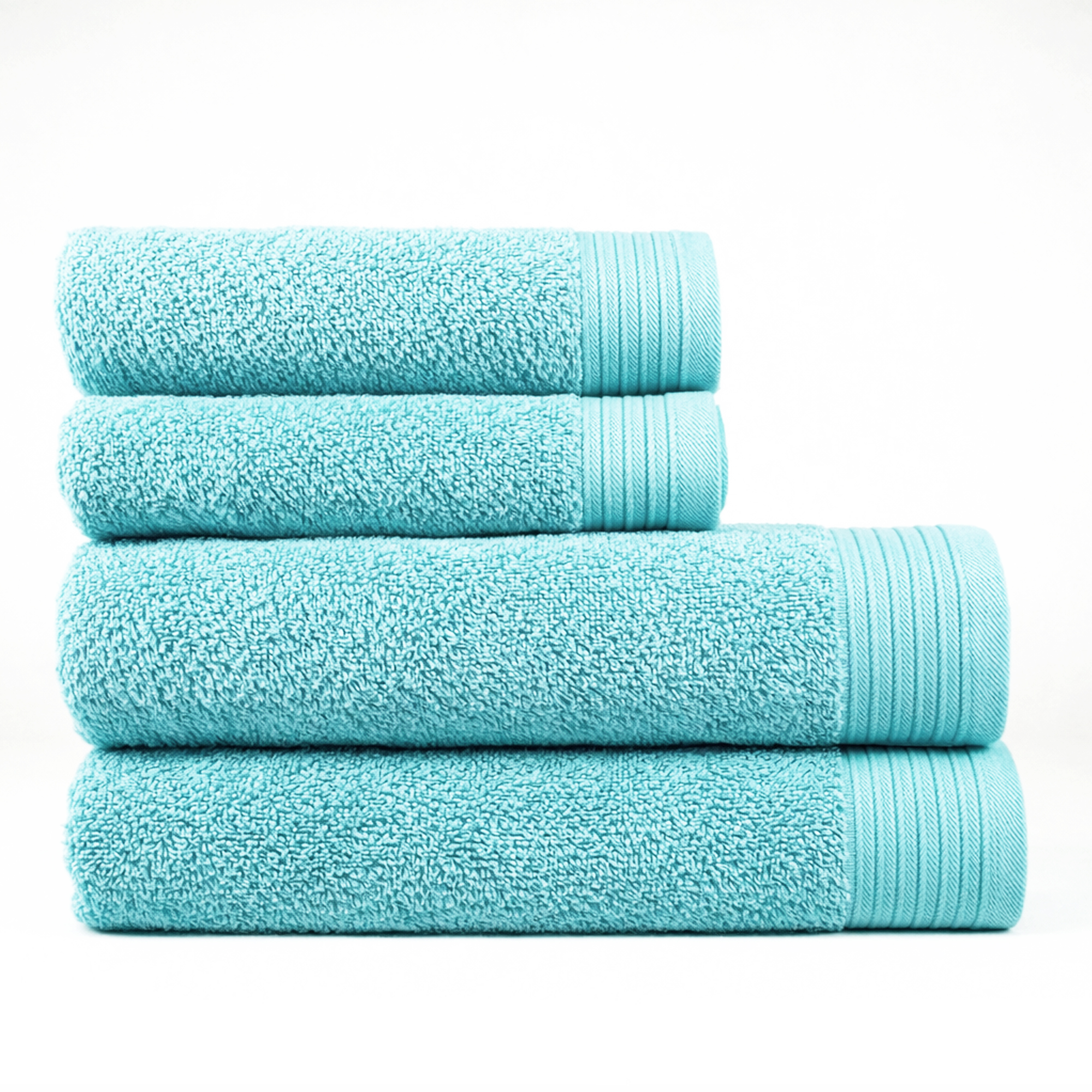 Juego de 4 toallas azul aguamarina liso de rizo. 100% algodón con una densidad de 450 grs/m2. Calidad al mejor precio.
