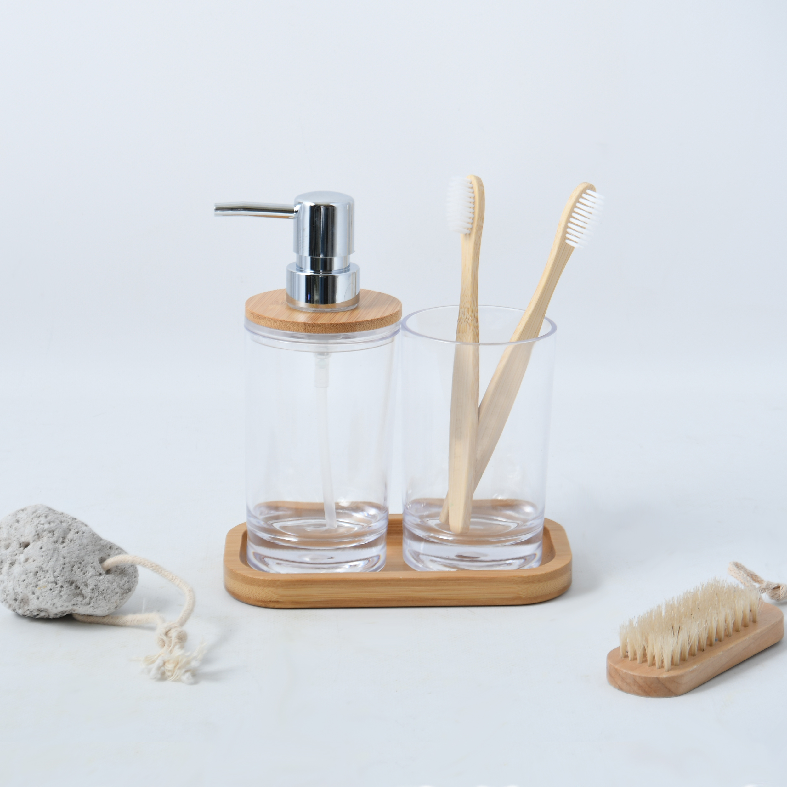 Set 3 pzas. que incluye un dispensador, un vaso y una jabonera de bambú y ps transparente.