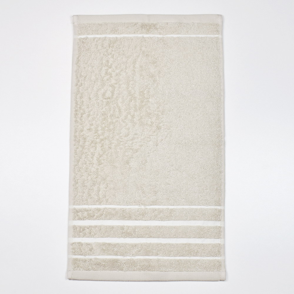 Toalla de rizo para el baño CRETA con elegante cenefa en jacquard, color arena, disponible en tamaño tocador, lavabo, ducha y baño 100% algodón con una densidad de 500 grs/m2. Muy suave y absorbente.