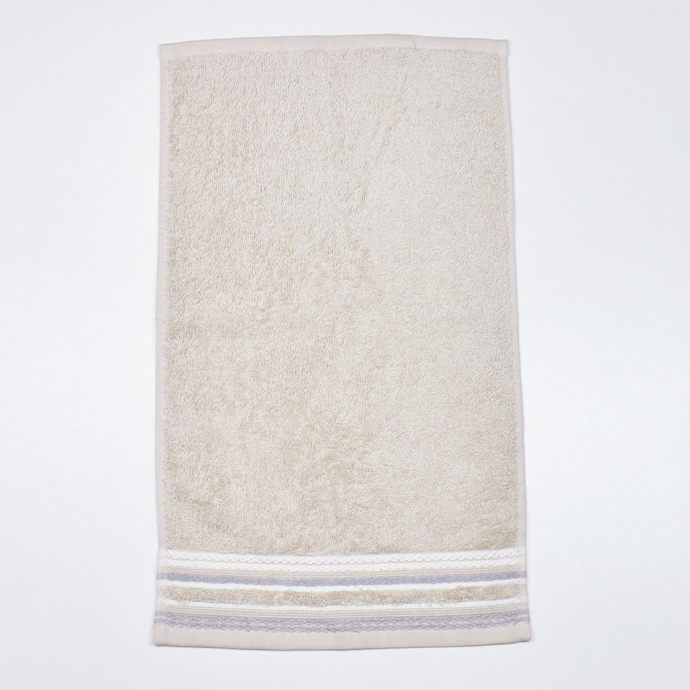 Toalla de rizo para el baño RODAS con elegante cenefa en jacquard, color arena, disponible en tamaño tocador, lavabo, ducha y baño 100% algodón con una densidad de 500 grs/m2. Muy suave y absorbente.